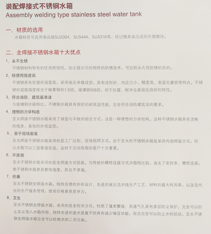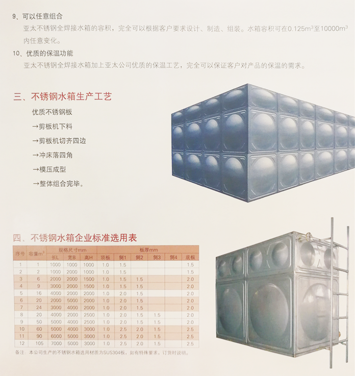 不銹鋼水箱十大優(yōu)點分析 1、永不生銹,不銹鋼材料特有的優(yōu)良耐腐蝕性,加之我公司獨特的防銹技術,可達到永久性防銹的目的。 2、輕便且強度高,不銹鋼具有輕便且強度高,采用液壓單模成型,具有成形好、內(nèi)應力小、精度高、表面無磨損等特點。不銹鋼的屈服強度相當于碳素鋼的1.5倍,玻璃鋼的6倍,對于抗震、耐沖擊表現(xiàn)出良好的特性。 3、符合消防、建筑基準法,與玻璃鋼水箱相比,不銹鋼水箱具有良好的耐高溫性能,完全符合消防建筑法的要求。 4、理想的力學結構,該系列全焊接不銹鋼水箱采用了球面與平板的組合方式,這事一種理想的力學結構。這種不銹鋼水箱具有流暢的線條、美觀的外觀造型。 5、易于現(xiàn)場安裝,該系列焊接不銹鋼水箱采用的是工廠壓制、現(xiàn)場組焊的方式,由于本公司生產(chǎn)的不銹鋼水箱是采用內(nèi)部焊接方式,所以水箱可以三面靠墻安放,這對于空間有限的客戶十分重要。 6、不滲漏,本公司生產(chǎn)的不銹鋼水箱采用的是全焊接方式組裝,與傳統(tǒng)的螺栓連接方式水箱相比較,省去了密封條、螺栓連接,使不銹鋼水箱更具整體強度,并且不滲漏。 7、價格實惠,本公司生產(chǎn)的不銹鋼全焊接水箱,獨特合理的外形設計、先進的液壓流水線生產(chǎn)工藝、材料的最大利用率,以及現(xiàn)代化的生產(chǎn)服務管理,使其價格更具競爭力。 8、衛(wèi)生,該型不銹鋼水箱采用的是全封閉方式,杜絕了藻類繁殖,其通氣孔具有多層防塵保護,完全可以防止灰塵落入水箱內(nèi)部,獨特先進的進水裝置不但具有減少噪音功能,且可以防止水的擾動。中大不銹鋼全焊接水箱完全可以杜絕水的二次污染。 9、容積大小可變,該系列水箱容積玩去哪可以根據(jù)客戶要求設計、制造、組裝。水箱容積可在0.125m3至10000m3之間任意變動。 10、優(yōu)質(zhì)的保溫功能,先進保溫工藝搭配優(yōu)質(zhì)保溫材料,完全可以保證客戶對產(chǎn)品的保溫的需求。 不銹鋼水箱常見的有不銹鋼消防水箱,方形組合式水箱、立式圓形水箱、臥式圓形水箱。采用SUS304、SUS316L、SUS444等不銹鋼板,沖壓成型。一般沖壓成三種尺寸,分別是1x1米、1x0.5米和0.5x0.5米三種,周邊用鎢極氬弧焊接,具有強度高、重量輕、成本低、環(huán)保衛(wèi)生等特點。制造標準為國家建筑標準02s101設計圖集。